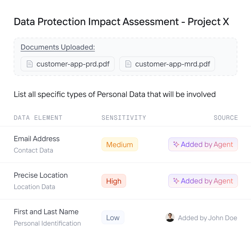 Populate entire DPIAs and PIAs with agents that analyze any related documentation such as PRDs, technical specs, & proposals. Extract data elements, 3rd parties, processing activities, and anything else needed to populate the assessment.