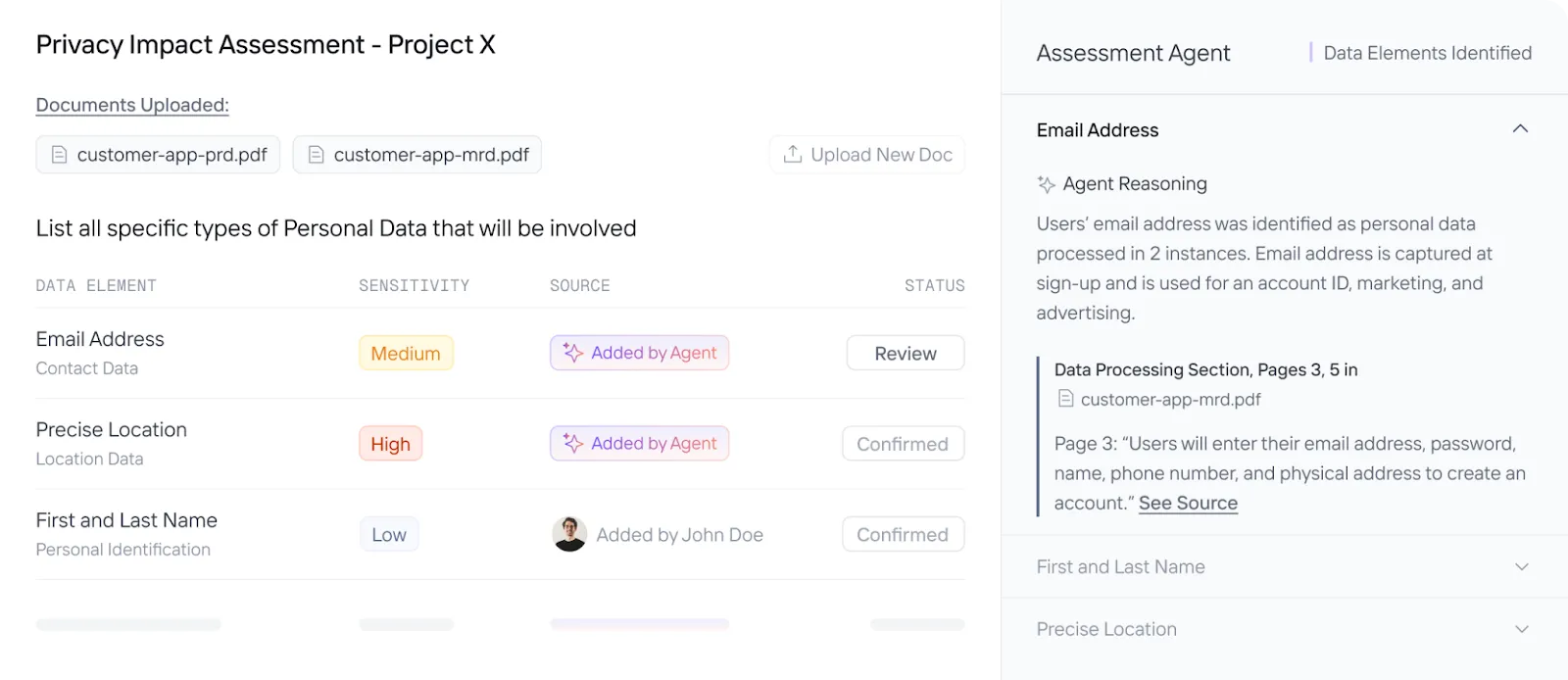 Instead of asking stakeholders to manually review documentation, fill in questionnaires, or complete interviews, stakeholders can simply import relevant documentation and contracts and let agents populate everything. The assessment agent analyzes any type of document: data flow diagrams, product requirement documents, technical specifications, project proposals, etc. The contract agent builds a contract inventory and bolsters assessment findings by extracting data elements, purposes of processing, obligations, and risks from third-party contracts.